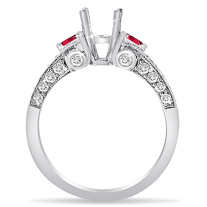 14K White Gold Ring with Trilliant Cut Ruby with pave set and bezel set accent stones.
